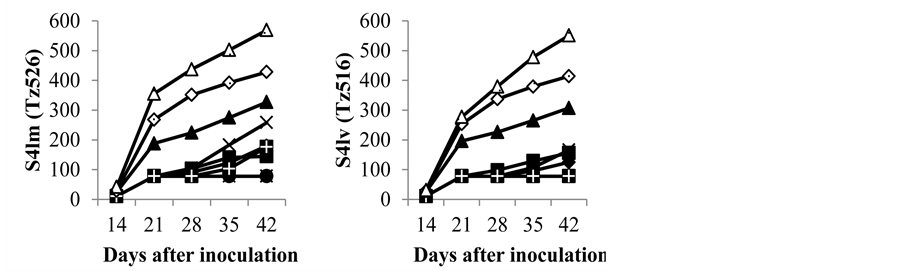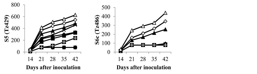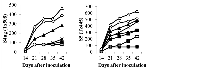 The resistance-breaking ability of Tanzanian RYMV strains and phylotypes were evaluated using rice differential cultivars with RYMV1 resistance gene. Disease progress and disease reaction classes are shown in Table 3 and Figure 1. The