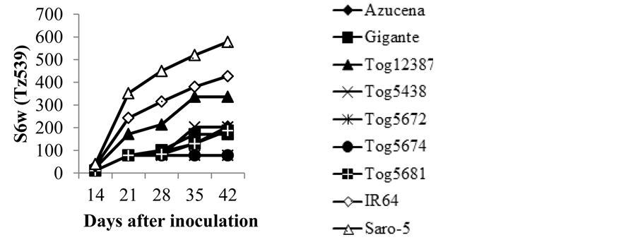 The area under disease progress curve (AUDPC) was statistically significant difference (P ≤ 0.05) between resistant rice cultivars and RYMV strains and phylotypes (Figure 1). Disease development in each RYMV strain and/or phylotype progressed differently with resistant rice cultivars depending on their resistance-breaking ability. The highest AUDPC was recorded in susceptible rice cultivar SARO-5 (631, 628) inoculated with S5 (Tz445, Tz429) followed by resistant cultivars Tog12387 (491, 478), Tog5438 (464, 458) and Gigante (333, 328), inoculated with S5 (Tz445, Tz429), respectively. These were followed by resistant cultivars Tog12387 (336, 327, 307) inoculated with S6w (Tz539), S4lm (Tz526) and S4lv (Tz516), Tog5438 (258) inoculated with S4lm (Tz526), Tog5681 (239, 237) inoculated with S5 (Tz445, Tz429), respectively. The lowest AUDPC were recorded in resistant rice cultivars Tog5672 (78) and Tog5674 (78) inoculated with all RYMV strains and phylotypes (S4lm, S4lv, S4ug, S5, S6c and S6w) followed by resistant rice cultivars Tog5681 (78) inoculated with S4ug (Tz508) and S6c (Tz486) and Gigante (85, 87) inoculated with S6c (Tz486) and S4ug (Tz508), respectively.
