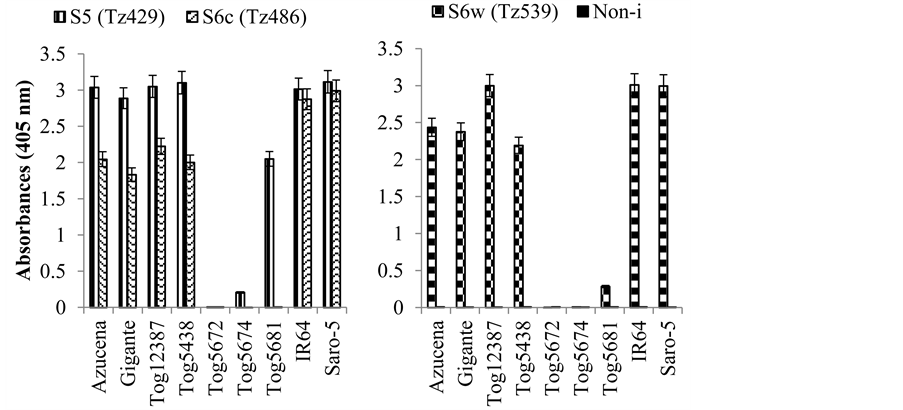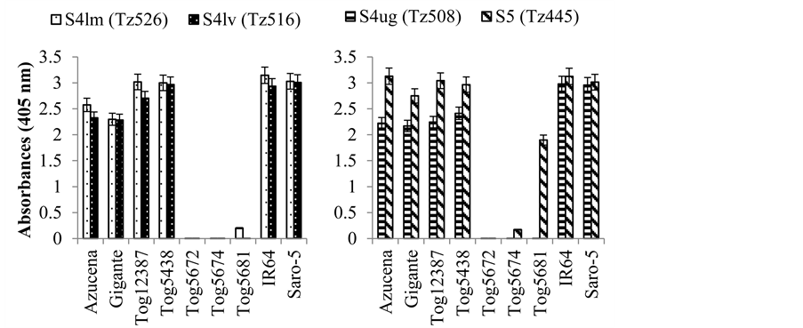 The titer of RYMV in resistant rice cultivars inoculated with different strains and phylotypes was measured by ELISA in order to confirm the resistance breakdown. Rice yellow mottle virus titer varied significantly (P ≤ 0.05) between differential resistant rice cultivars (Figure 2(a) and Figure 2(b)). Rice cultivars Azucena, Gigante, Tog12387 and Tog5438 inoculated with RYMV strains S5 (Tz445, Tz429) gave significantly higher virus titer than those inoculated with phylotypes S4lm (Tz526), S4lv (Tz516), S4ug (Tz508), S6c (Tz486) and S6w (Tz539) (Figure 2(a)-(d)). However, the highest RYMV titer was obtained in leaf extracts of rice cultivars Tog12387 inoculated with phylotypes S4lm (Tz526) and S6w (Tz539) and Tog5438 inoculated with phylotypes S4lm (Tz526) and S4lv (Tz516) (Figure 2(a)-(d)). By contrast, Tog5674 inoculated with strain S5 (Tz429, Tz445) and Tog5681 inoculated with phylotypes S4lm (Tz526) and S6w (Tz539) had the lowest virus titer. The results also revealed the presence of the virus in asymptomatic plants of Tog5674 inoculated with RYMV strain S5 (Tz445) (Figure 2(b)).