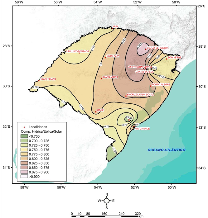 This section describes the method for determination of cmoplementarity and presents a map containing values of the complementarity index for three energy resources throughout the State of Rio Grande do Sul, the southernmost state of Brazil. The three resources considered were hydropower, wind and solar energy. Figure 4 shows this map.