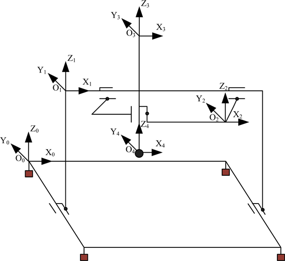 Taking the Frame-XYZ type mechanism as an example, the schematic diagram of the structure of three-axis MAS and corresponding coordinate frames is illustrated in Figure 2. The HTM that can describe the spatial relationship between the RCS and the tool coordinate frame can be given as: