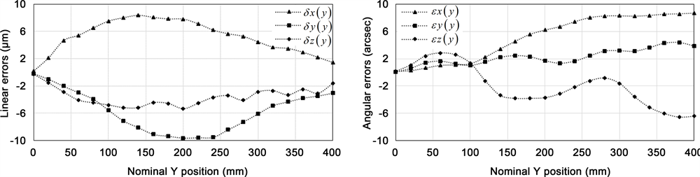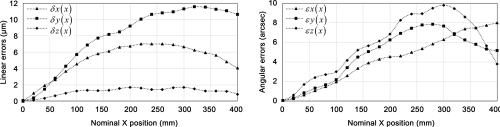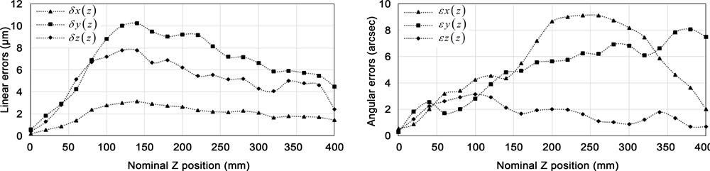 The results of the geometrical error measurements, illustrated in Figures 7-9, show that the linear displacement errors are larger than the specified CMM accuracy of ±2 μm (7 μm, 10 μm and 8 μm respectively for X, Y and Z axis). The maximum straightness errors vary on average between 10 μm and 12 μm depending on the measured axis. Finally, pitch, yaw and roll errors measured at the same positions are similarly presented. The maximum angular errors average between 7 and 10 arcsec.