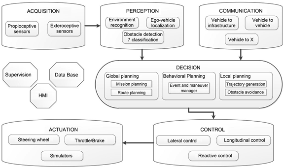 This architecture is based on the different advances developed by different international research groups and centres: California PATH, Karlsruhe Institute of Technology (KIT), the University of Parma (and Vislab), Carnegie Mellon University (CMU), Darpa Grand Challenge, Hanyang University, INRIA, etc.