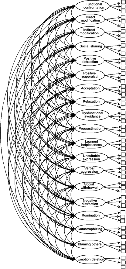 Model 2 is a model with two second-order factors (i.e., functional strategies, and dysfunctional strategies) and nineteen dimensions (i.e., functional confrontation, direct modification, indirect modification, positive distraction, positive reappraisal, acceptance, relaxation, social sharing, dysfunctional avoidance, procrastination, learned helplessness, negative distraction, rumination, catastrophizing, blaming others, emotion deletion, unsuitable expression, verbal aggression, and social withdrawal), each operationalized by three items. This model represents the theoretical model of Mikolajczak (2012) in all its complexity (see Figure 1).