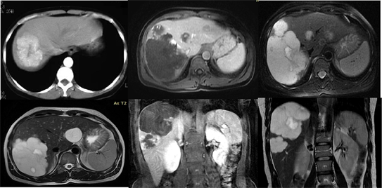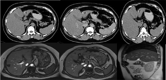 Figure 6. Imaging of Biliary Cystadenocarcinoma with CT and MR.