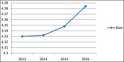 Figure 2 represents the IPCR rating of the respondents from 2013-2016. In the year 2013 before the implementation of the use of BARS, the IPCR rating of the respondents was 4.330 (VS). In 2014, the pilot year when the BARS was implemented by the city government, there was a slight increase in the respondents’ IPCR rating which is 4.332 (VS). In the year 2015 & 2016, the respondents IPCR rating were 4.348 (VS) and 4.384 (VS) respectively. There was an increase in the respondents’ IPCR rating from 2014 when the BARS was first implemented to the succeeding years 2015-2016 [4.332 (2014) - 4.348 (2015) - 4.384 (2016)].