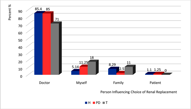 Fadem et al showed that external influences such as physician’s recommendations affected how patients choose a therapy and disclosed a general preference for physician-based education [34] . In this study, the patient’s physician had the greatest influence on renal replacement therapy choice. Patients with a greater knowledge and understanding of their present therapy may feel more empowered to make decisions and directly contribute and initiate other aspects of management like lifestyle modifications, adherence with medications and follow up visits at clinic.