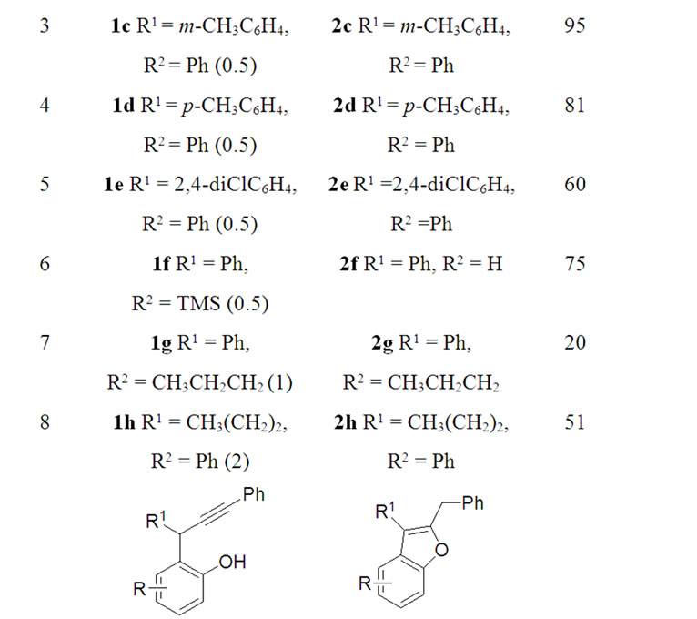 reaction was application to various propargylnaphthols and phenols, and for the most tested substrates, good results have also been obtained. Naphthols with an electron-donating aryl group at propargylic position cyclized smoothly to give the products in high yields, no matter substituents appeared in ortho, meta or para positions (Table 2, entries 2 - 4), while the electron-withdrawing aryl group naphthol (1e) apparently lowered yield (entry 5). The trimethylsilyl-substituted naphthol, 1f, reacted to produce the respective naphthofuran in a moderate (75%) yield and the TMS group happened to undergo desilylation at the same time (entry 6). When a propargylnaphthol with a butyl group at the triple bond was used, the desired product 2g was obtained in a poor yield (entry 7). On employing naphthol with a propyl group at the propargylic position, cyclization product 2h was obtained in moderate yield (entry 8). Furthermore, the propargylphenols were also examined. The presence of electron-donating group on the aromatic ring gave moderate to good yields (entries 9 - 11). Introducing an electron-donating aryl group at the propargylic position, the reaction proceeded smoothly to give the corresponding cyclization products (entries 12 and 13).