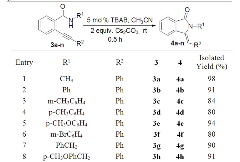 Typical procedure for the preparation of 3-methyleneisoindoline-1-one derivatives 4a to a solution of 3a (0.20 mmol) in 2.0 mL of CH3CN was added Cs2CO3 (130.4 mg, 0.40 mmol). The mixture was allowed to stir at room temperature when TBAB (3.22 mg, 5 mol%) was added. When the reaction was considered complete as determined by TLC analysis, the reaction was allowed to quench with a saturated aqueous solution of ammonium chloride, and the mixture was extracted with EtOAc. The combined organic extracts were washed with water and saturated brine. The organic layers were dried over Na2SO4, filtered. Solvents were evaporated under reduced pressure. The residue was purified by chromatography on silica gel to afford 3-methyleneisoindoline-1-one derivatives 4a.