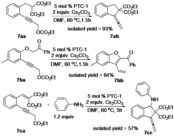 In conclusion, phase-transfer-catalyzed intramolecular hydroaryloxylation and hydroamination reaction of corresponding O/N-containing substrates is a novel and efficient method for synthesis of heteroatomic compounds. We also described the cyclization reaction of propargylic carbonates under metal-free condition. These reactions are run under mild conditions, tolerate various functional groups, and generally a wide range of substrates undergo this process in good to excellent yields. Compared to the expensive and toxic transition-metal catalyzed reaction, this methodology showed considerable synthetic advantages in terms of mild reaction conditions, environmenttally friendly catalysts and simple experimental operations. The scope and synthetic application of these reactions are currently under investigation.