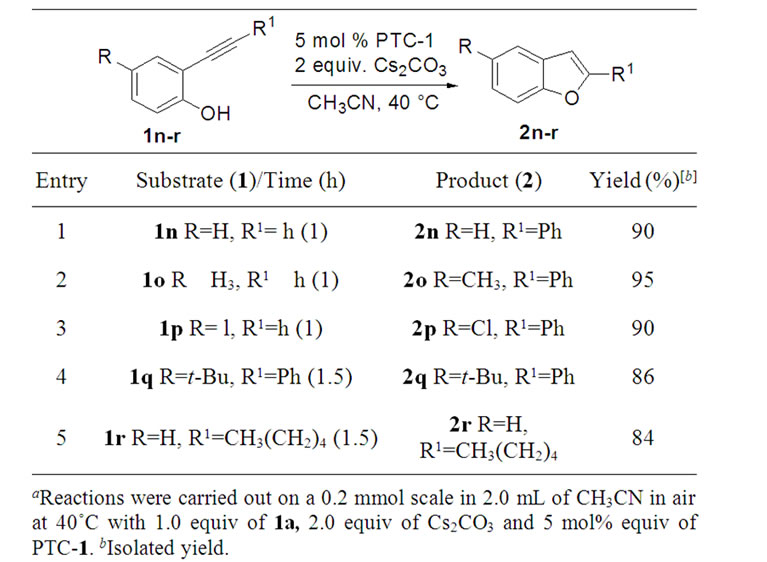 Furthermore, to expand the scope of this reaction, we also investigated the ethynylphenol 1n-r. As depicted in Table 3, for all the tested substrates, the phase-transfercatalysts intramolecular cyclization of ethynylphenol could prove to be a very effective method for the synthesis of a variety of monosubstituted benzo[b]furans and the reaction can be tolerant of the substitution groups in aromatic ring (Table 3, entries 1 - 4). It is noteworthy that when R1 was replaced by an alkyl group, the reaction proceeds smoothly to give the corresponding product in good yield (entry 5).