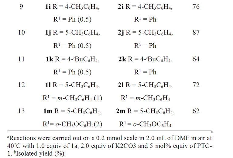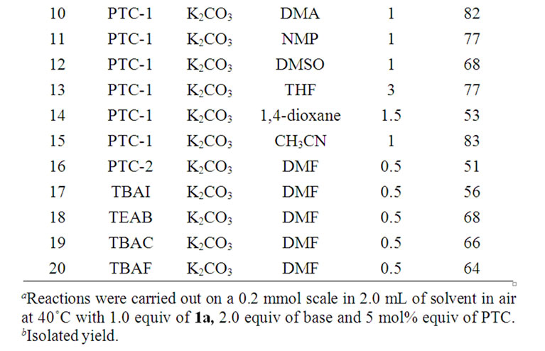 conditions. Other common bases, such as K2CO3, Li2CO3, K3PO4, KOAc, K2HPO4, KHCO3 were also tested; K2CO3 gave the best yield of 85% (entries 2 - 7), which indicated that base played an important role in the process. In the absence of PTC condition, the product was obtained in low yield (entries 8 and 9). The effect of the solvent was also investigated. Changing solvent to DMA, NMP, DMSO, THF, 1, 4-dioxane, CH3CN failed to improve the yield of the product 2a (entries 10 - 15). When different PTCs were examined, the results showed that PTC-2 could also promote this cyclization, but the desired product 2a was only obtained with 51% yield (entry 16). Tetraalkyl ammonium salts, such as Bu4NI, Et4NBr, Bu4NCl, and Bu4NF have also been applied to this process, and the yields were not better than PTC-1 (entries 17 - 20). Thus, we chose the following reaction conditions as optimum for subsequent cyclization: 0.20 mmol of 1a, 5 mol % PTC-1, and 0.40 mmol K2CO3 in DMF at 40˚C in air.