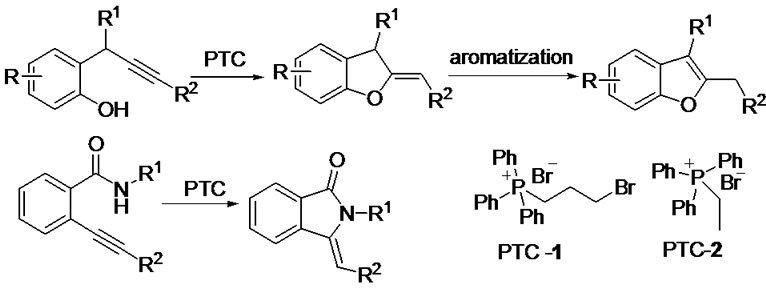 The addition of heteroatomic nucleophiles to C≡C triple bonds is an important reaction that often requires a high activation energy [1,2]. The transition metal-catalyzed construction of heterocycles is one of the frontier areas in organic chemistry, because of the exceptional ability to activate the triple bond, towards intermolecular and intramolecular nucleophilic attack [3-7]. Oxygen-containing heterocyclic moieties such as benzo[b]furan rings represent key structural units of a variety of natural compounds with interesting biological and pharmacological activities [8-10] and a number of routes leading to differently substituted benzo[b]furans have been described by metal-catalyzed intramolecular ring closure[11-16]. Meanwhile, nitrogen-containing heterocyclic moiety 3- methyleneisoin-doline-1-one is a core structure of numerous natural products and has also been prepared in the literature.[17,18] Compared with other methods phasetransfer catalysis has long been recognized as a versatile methodology for organic synthesis in both industrial and academic laboratories, featuring its simple reaction procedure, safe, inexpensive, environmentally friendly reagents, absence of anhydrous solvents, ease of scale-up, and metal-free conditions [19-22].