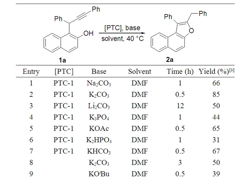 Initially, we focused on the reaction of 0.20 mmol of 1-(1,3-diphenylprop-2-ynyl)naphthalen-2-ol (1a), 5 mol % of PTC-1 and 2 equiv of Na2CO3 in DMF at 40˚C in air. To our delight, the desired product benzo[b]furan 2a was formed in 66% yield after 1 h (Table 1, entry 1). Encouraged by this result, we further optimized the reaction