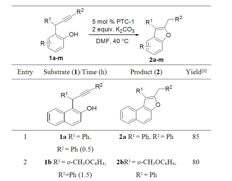 Table 2. Phase-transfer-catalyzed synthesis of disubstituted benzo[b]furan derivatives (2a-m)a.