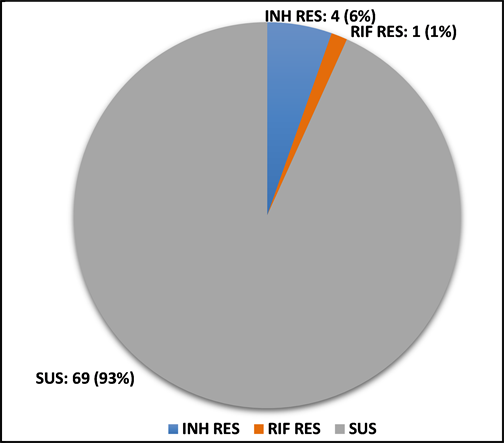 Figure 1. Drug Susceptibility Test (DST) profile of isolates (N = 74) obtained from the TB/HIV co-infected participants. INH RES: isolates that are resistant to isoniazid. RIF RES: isolates that are resistant to rifampicin. SUS: isolates that are susceptible to both isoniazid and rifampicin.