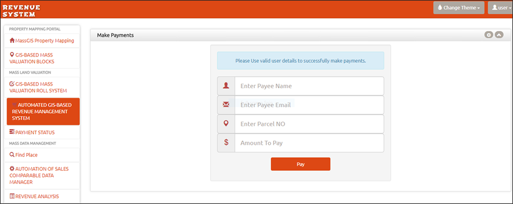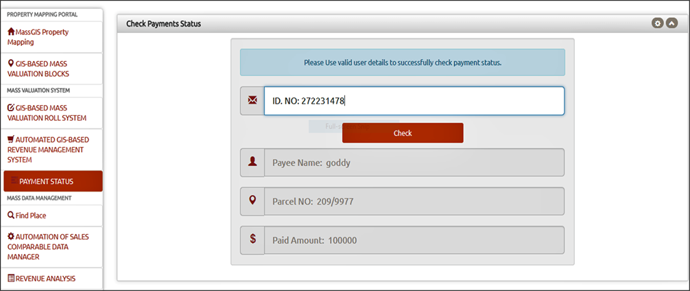 The development of a GIS assisted mass appraisal system in this research can be used to optimize revenue collection from the property taxes of the valued properties based on an up-to-date centralized mass valuation roll database. The system in Figure 10 provides a solution by creating an electronic client and centralized property database for easy and reliable management of revenue resources from the property taxes. The property taxes can be monitored with the system on real time basis using a web-based GIS maps. Automation of revenue collection system boosts revenue E-enforcement through real time verification of the property tax payer records shown in Figure 11. The collected revenue can be used to provide services and infrastructure thus improving the lives of all the people in the county. This system supervises the timely collection and disposition of property taxes within the mass land valuation authority.