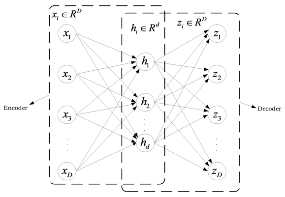 The input layer of the AE has the same number of nodes as the output layer. The process of encoding and decoding can be regarded as compressing the input data, and representing the high-dimensional original data with a low-dimensional vector, so that the compressed low-dimensional vector can be retained.