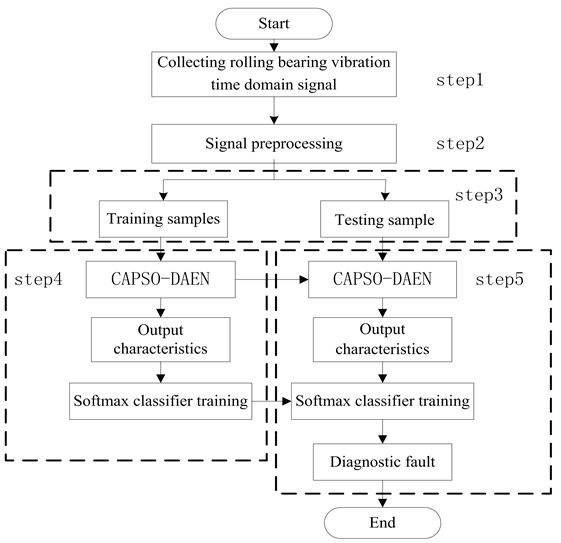 The intelligent fault diagnosis model of rolling bearing based on CAPSO-DAEN is divided into the following steps, as shown in Figure 3, the steps are as follows: