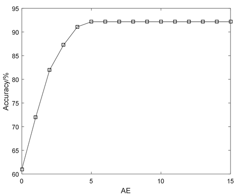 The average accuracy of fault diagnosis was tested when the number of AE layers was 0 - 15. The results are shown in Figure 4. As can be seen from Figure 4, when the number of AE layers is 4, the average accuracy of fault diagnosis is already high, and then the correct rate increases slowly as the number of AE layers increases. In actual training, as the number of AE layers increases, the training time increases linearly. Taking into account the two factors of fault diagnosis and training time, the number of AE layers selected in the following test is 4 layers.