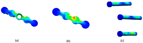 Figure 4. Stress distribution in fixation techniques at 3 mm mandibular advancement and 300 N force. (a) Model 4: 6-hole 1.7 mm miniplate; (b) Model 5: 2.0 mm miniplate with 4.4 mm gap; (c) Model 6: 2.0 mm bi-cortical screws.