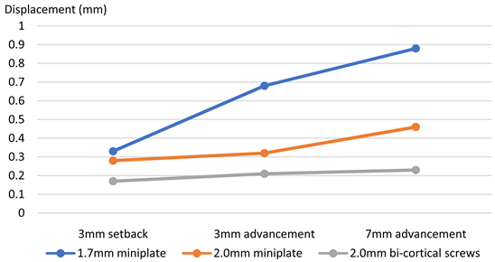 The amount of displacement is an indication of fixation rigidity, and the bi-cortical screws were shown to be the most rigid fixation. Miniplates can be rigid or functionally stable and clinically have both been proven to be successful in the treatment of mandibular fractures [23] . In our study, the maximum displacement is less than 0.9 mm which was seen in Model 7 that consisted of the 1.7 mm miniplate at 7 mm mandibular advancement. The amount of displacement is small in the simulation models and is probably not clinically significant. Claes in 1998 claims that some degree of micromotion in bone in-fact enhances callus formation during bone healing, and this may be an advantage of semi-rigid fixation [24] . Least displacement is seen in the setback models, and is likely due to the close approximation of the mandible segments. Like mandibular fractures, the close approximation of bony segments increases stability of the fracture [22] .