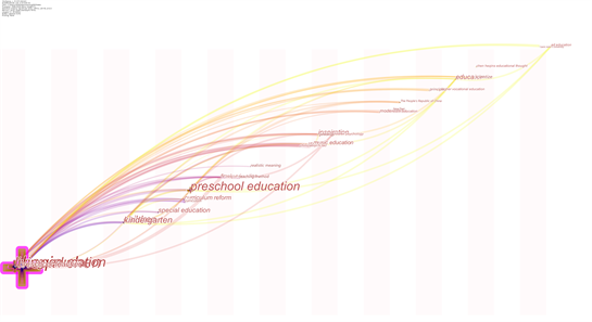 Based on the above operations, the results of Figure 2 and Figure 3 are generated. As shown in Figure 2, the larger the font, the higher the frequency of research keywords. The co-occurrence network graph clearly reveals the research focus and research direction of CNKI in the past twenty years, which is consistent with Table 1. In order to understand the research direction of Heqin Chen’s educational thought further in recent years, this study shows the keyword changes in the past 20 years through the time zone visualization function of Citespace, as shown in Figure 2.