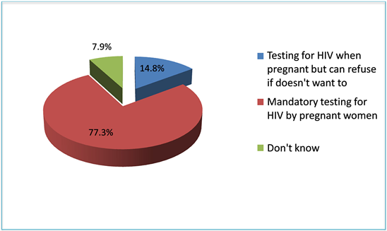 Concerning acceptability of routine HIV testing, most (99%) of the respondents stated that it was important to test for HIV in pregnancy but only 85.5% indicated willingness to undergo routine HIV testing in this pregnancy (Table 2). However, 77.3% of the respondents perceived routine HIV testing as a mandatory test (Figure 1).