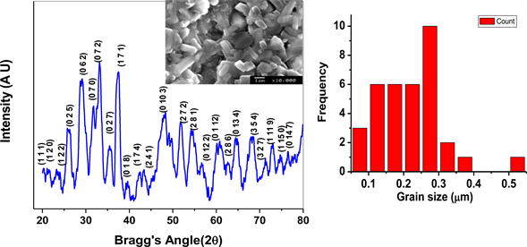 The room temperature scanning electron micrograph of the compound shown in Figure 1 (inset) resembles polycrystalline arrangement of the material with grains of irregular in shape and size distributed non-uniformly and densely over the entire surface of the sample. A similar microstructure is also observed in some of our materials of this family [9][10]. The grain size of the sample from histogram (Figure 1 (right)) was measured to be in the range of 220 nm.