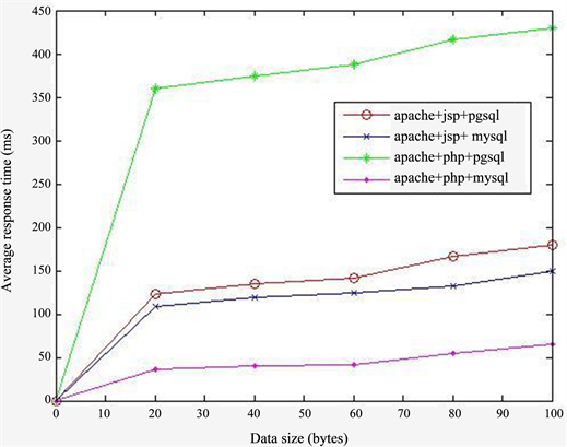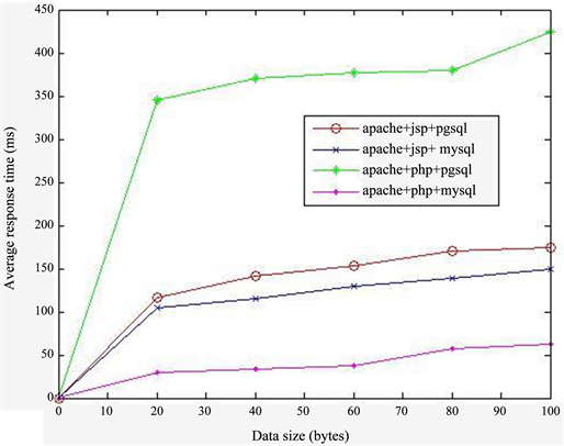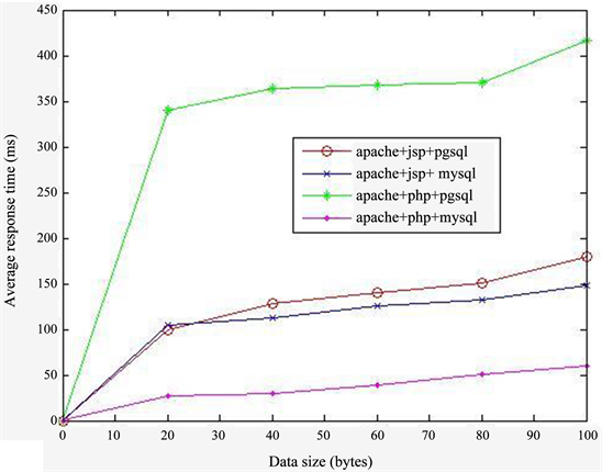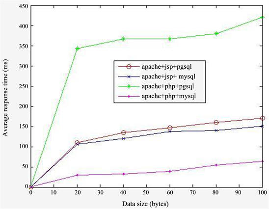 First, we send queries on dynamic Web pages with the extension *.jspor *.php. Each HTTP request causes a SQL SELECT command to retrieve data from the database PostgreSQL or MySQL. Next, we varied the size of data to be retrieved from the database so that we can determine the impact of the size of data on server performance. For each configuration we have shown in Figure 1, we vary the size of data to get 20, 40, 60, 80 and 100 bytes. PostgreSQL and MySQL database each has a single table with four columns.