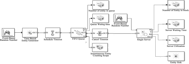 The OUT port of the FIFO queue block is connected to the IN block Cancel Timeout cancels a timer event that the Schedule Timeout block has already provided for the entity arrival in the FIFO queue block. The cancel Timeout block is connected to the single server block representing our Web server. The w use of single server block port is connected to a respective block Waiting time Server that provides visualization of the curve of Waiting time in the server and using the curve that shows the utilization of the server.