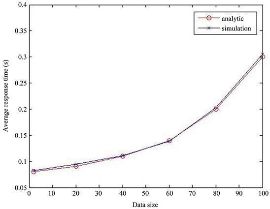 Considering Figure 10, we note that logically, the two curves of the response time increase gradually with the size of the data. It can be explained by the increase of the length of the queue when the size of data increases. When the size of data becomes big, more time is necessary for the server to handle it. The two curves of the analytic model and the simulation are nearly identical; we can affirm it by the value of the Mean Square Error (MSE) between the two curves that is very small. The value of this MSE is equal to: 0.004.