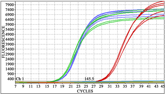 3) The tube based real-time PCR suffers from the limitation of extracting enough DNA from cashmere fibers [12] . But the microchip based real-time PCR requires a miniaturized amount of DNA (1 µl of 10-fold diluted DNA extracted from the animal fibers) and thus extracted DNA can suffice for the tests.