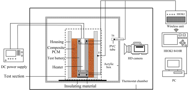 All tests in this work were conducted at an ambient temperature of 25˚C obtained by setting the thermostat chamber. The change of heating power was achieved by changing the voltage and current of the DC power supply. The temperature of test battery was measured by the four K-type thermocouples (T1, T2, T3, T4) fixed in the holes drilled at the top and bottom end surfaces, each hole 1.5 mm in diameter and 10 mm in length with its center 7.25 mm away from the cylinder center. And the thin aluminum foil of 0.04 mm thick had been tightly wrapped around the thermocouple to ensure the good thermal contact with the wall of the hole. The thermocouple T5 was placed onto the middle of housing wall to measure the housing temperature. The ambient temperature T6 was measured by another thermocouple inserted into PVC tube mounted inside the acrylic box. HIOKI 8410R was used for data acquisition and the thermocouple readings were recorded in 5 s interval, and the HD camera (Nikon D5100) was used for visual tracking of phase change process, and the DC power supply (GWINSTEK PSW110-21.6) was used to provide constant heat input for the heater.