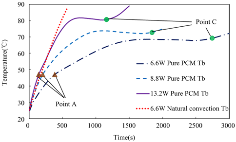 option. As shown in Figure 2, the Tb evolutions of the pure PCM option can be divided into three distinct segments: OA segment, AC segment, CE segment. Here O and E are the starting point and the ending Point, respectively, not shown in Figure 2. The Point A is the melting point of PCM and the Point C is the effective thermal control time point. There was no phase change in the OA segments, and the heat dissipation depended on the battery heat capacity and natural convection heat loss. Therefore, OA segment exhibited high rate of temperature ramp-up. When Tb reached the melting point of 47˚C, the PCM started to melt and absorb heat generated by the test battery, and a plateau of temperature can be clearly observed in the AC segment. Therefore, Point C can be regarded as the end of temperature control with PCM, beyond the Point C, the Tb increased at an accelerated rate.