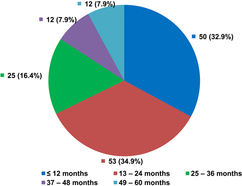 In the present research, stool sample from 325 children with confirmed diagnosis of acute diarrhea were collected and among those, 152 stool samples showed positive bacterial growth. Figure 1 gives details of the age categories (months) of 152 children with positive stool culture. Among all 152 positive culture isolates majority, 53 (34.9%) were found to be in the age group of 13 - 24 months, around eight percent in less than or equal to 12 months and 37 - 48 months of age categories. Figure 2 gives details of gender distribution. Majority, 57% were males while forty three 43% percent were females.