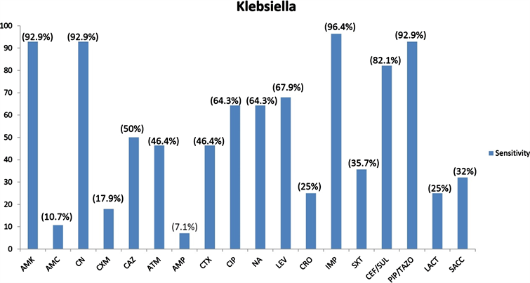 Figure 4. Sensitivity patterns of Antibiotics and Probiotics, Lactobacilli (Lactobacillus paracasei/Lactobacillus acidophilus) and Saccharomyces boulardii for Klebsiella (n = 56).