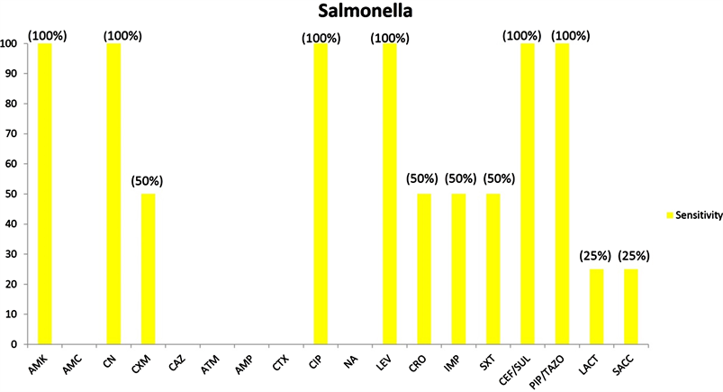 (95.7%) Imipenim (95.7%) and Piperacillin/Tazobactam (84.8%). While, the other antibiotics which showed lower sensitivity are Amoxicillin/Clavulanic acid (17.4%), Ceftazidime (13%), Ampicillin (6.5%), Cefotaxime (13%) and Nalidixic acid (26.1%). Moreover, for Klebsiella the highest sensitivity was observed for Imipenim (98.2%), Amikacin (94.6%), Piperacillin/Tazobactam (92.9%) and Gentamycin (89.3%). Although, lower sensitivity is observed for Amoxicillin/Clavulanic acid (10.7%), Cefuroxime (17.9%), Ampicillin (7.1%) and Ceftriaxone (25%), for Salmonella typhi the highest sensitivity (i.e. 100%) was observed for Amikacin, Gentamycin, Ciprofloxacin, Levofloxacin, Cefoperazone/Sulbactam and Piperacillin/Tazobactam. Whereas, some of the antibiotics such as Cefuroxime, Ceftriaxone, Imipenim, Trimethoprim/Sulfmethoxazole revealed moderate sensitivity (i.e. 50%). Few of the antibiotics had shown no sensitivity. However, for Lactobacilli the sensitivity for E. coli, Klebsiella and Salmonella typhi were 28.3%, 25% and 25% respectively. While for the second probiotic, Saccharomyces boulardii the sensitivity for E. coli, Klebsiella and Salmonella typhi were 37%, 32.1% and 25% respectively.