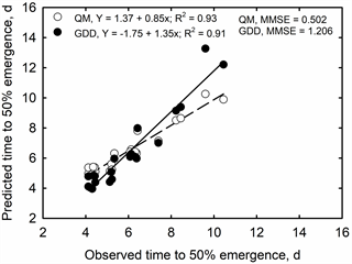 where DIF is the difference between observed and predicted values, MDIF is the mean DIF, and ni is the number of observations in the validation experiment. Based on this, the model with the smallest MMSE was considered as the best model. This was necessary because the different experimental conditions were sampled on different validation experiments. Based on these model validation metrics, the QM performed slightly better the GDD model for soybean seed emergence over a wide range of environmental conditions, planting dates, and cultivars. Both the models, however, have higher R2 when regressed between observed and predicted days for seed emergence (Figure 2).