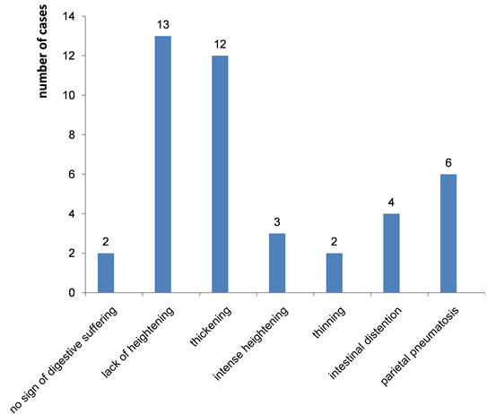 Figure 1 represents the distribution of intestinal lesions: The lack of parietal heightening was the most frequent lesion, noted in 13 cases (Figure 2(A)), followed by parietal thickening noted in 12 cases (Figure 2(A)).