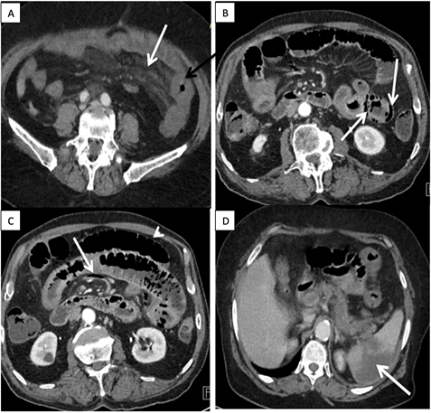 Figure 2. Abdominal angioscan with injection of contrast dye in portal phases, axial sections. (A) Thickening with lack of heightening of the left colonic lining (black arrow); mesenteric infiltration (white arrow); (B) Aeromesentery (white arrow), parietal tightening with intestinal distention (head of white arrow); (C) Parietalpneumatosis (white arrows); (D) Splenic infarction (white arrows).