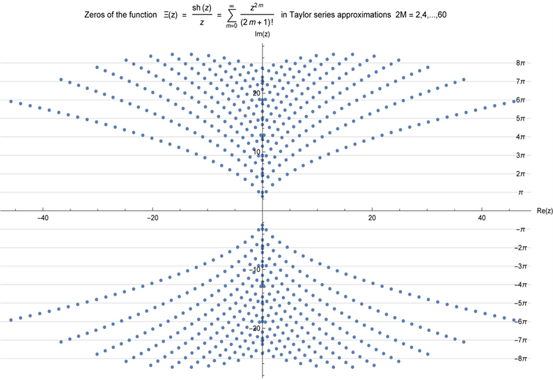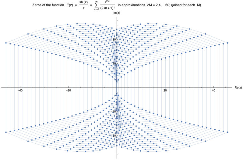 on the values given in the third and fourth column on the right-hand side did not become fully stable in our calculations in dependence on the number of sum terms taken into account in (2.14) and the chosen upper limit of integration that is rather due to the limits of our computer capabilities. The genuine value for the third root is near to 25.0109 instead of the stabilized 25.0101 seen in the table. The fourth root is at 30.4249. Therefore, the table reflects one such calculation. Onto the following graphical illustrations of zeros this does not have a visible influence. From the series (4.3) one may guess how difficult such calculations are even for a computer.