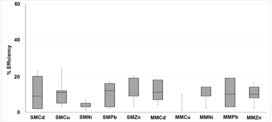 For the SM-contaminated BC the average efficiency over all metals and extractants were ~9% and ranged from 1% - 24%. If this is compared to the average extraction efficiency from QS at 92% ± 5.6% (data not shown here) it is evident that the BC substrate more strongly retained all metals and therefore values for efficiencies are significantly lower than for QS. For the MM-contaminated BC, the average was 11% and ranged from 1% - 30% in comparison to an average of 82% ± 9.8% for the QS (data not shown here). Taking the relatively large