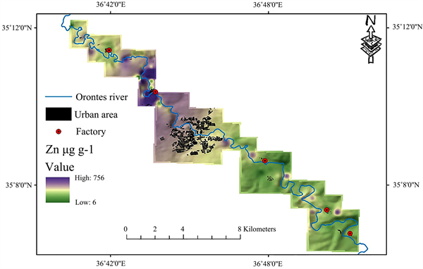 Geostatistical methods are often used for prediction mappings of soil properties, because it can calculate unbiased estimates at un-sampled locations [49] - [54] . Since pollution in soil presents a continuum in their spatial variations, geostatistical methods are widely used to display this variation and to reduce costs of investigation and to recognize the contamination on sources [55] [56] [57] . The aims of this study are: 1) to investigate the contents of four heavy metal (Cu, Zn, Cd and Pb) in both river water and soil of pilot area of Orontes basin, 2) to characterize the spatial distributions of this heavy metal, 3) to provide an insight into possible heavy metal contamination by generation of the predicted maps.