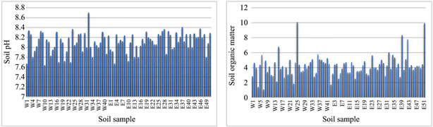 The pH and organic matter content of the soils are very important factors in controlling mobility and concentration of elements in the soils. The pH values ranged from 7.5 to 8.6 (Figure 4). The results indicate that the soils within the study area are alkaline; (higher pH values) not favor the availability of cations in soil [66] . That might be explained by the calcareous origin of the parent material as the soil total calcium carbonate content ranging from 23% to up 44%. The Organic matter (OM) content in soil showed high value comparing to soil existing in the area, ranging from less than 1% to 9.8% (Figure 4).