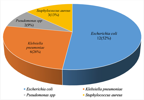 From 23 bacterial isolates; Gram-negative bacteria 20 (87%) were dominating as compared to Gram positive bacteria isolates 3 (13%). The highest bacterial isolates were Escherichia coli 12 (52%), followed by the Klebsiella pneumoniae 6 (26%), Staphylococcus aureus 3 (13%) and Pseudomonas spp. 2 (9%) as shown in Figure 2.