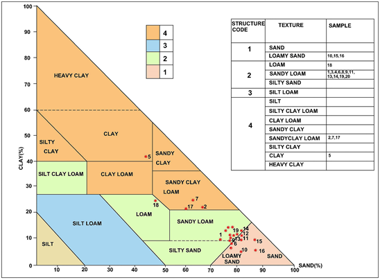 Percentage composition of sand, silt and clay plays an important role for determined basic nomenclature of texture class (Lahiri, 1964; Brady, 1999) . The area is fully dominated by sandy loam soil; other important soil textural type is loamy sand (Figure 3). This type of soil is usually made of sand along with lower amounts of silt and clay. It is very suitable for agriculture. This type of soil has good drainage condition. This type of soil must have more than 65% of sand particle by volume in a sample. It also allows conditions for good vegetation growth. Sandy loam soil type has some structure and relatively good quality in fertility. More than 75% soil sample of the study area is bearing the characteristics of loamy sand and sandy loam, other predominant soil texture is sandy clay loam and occasionally loam. Clay loam and silt clay are two less important soil types of this area. In the year of 1993 Ontario Centre for Soil Resource Evaluation had made a soil texture code based on soil textural classification (Figure 4(a)). This system has four structural codes; each code contains different soil type according to their texture. The area falls under code 2. Structure code 2 is associated with sandy loam, loam and silty sand soil type. Another important code is 1. In this discussion structure code 1 is loamy sand and sand in soil type. There are 65% of samples are under structure code 2 (USDA: sandy loam; Ontario: sandy loam, loam, silty sand). Ontario Center for Soil Resource Evaluation has designed permeability code based on soil type (Figure 4(b)). Here author has put five statuses along with Ontario permeability code that is also associated with USDA specified soil type. In this present study, more than 50 percent samples of all four study areas belong to permeability code 2, that is medium permeable in character.