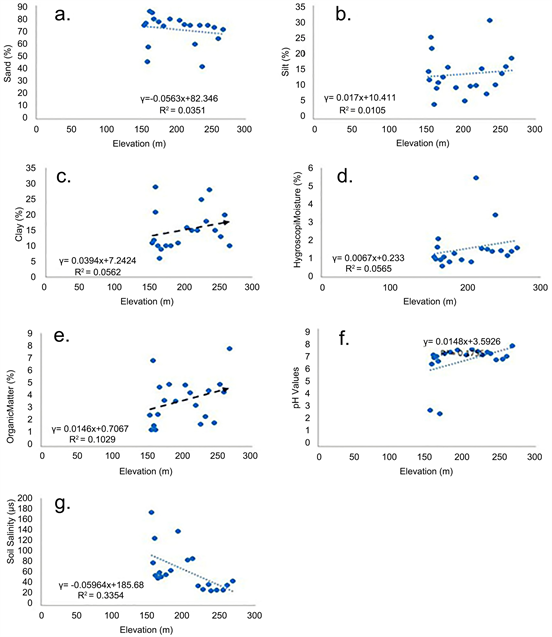 Figure 6. Relationship between elevation and sand (a), silt (b), clay (c), hygroscopic moisture (d), organic matter (e), pH (f), salinity (g).
