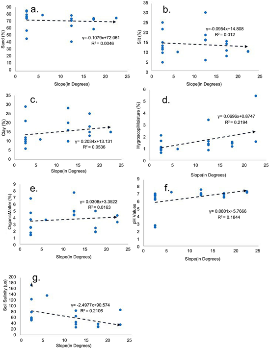 Figure 7. Relationship between slope and sand (a), silt (b), clay (c), hygroscopic moisture (d), organic matter (e), pH (f), salinity (g).