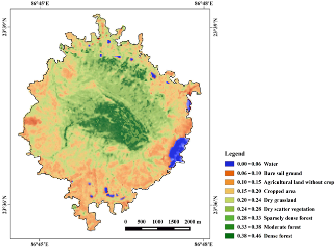 Categories of land use and land cover of that area have been developed on the basis of soil geomorphological character. Dense forest is located on the high elevated less slopped areas. Moderate vegetation is located on the medium elevated and relatively greater slopped areas. Steep slopped and escarpment area are dominated by scattered vegetation and grass land. Agriculture is developed on the foothill pediment areas where elevation and slope is very less and thick layer of relatively fertile soil is present. Depth of the soil at escarpment area is less.